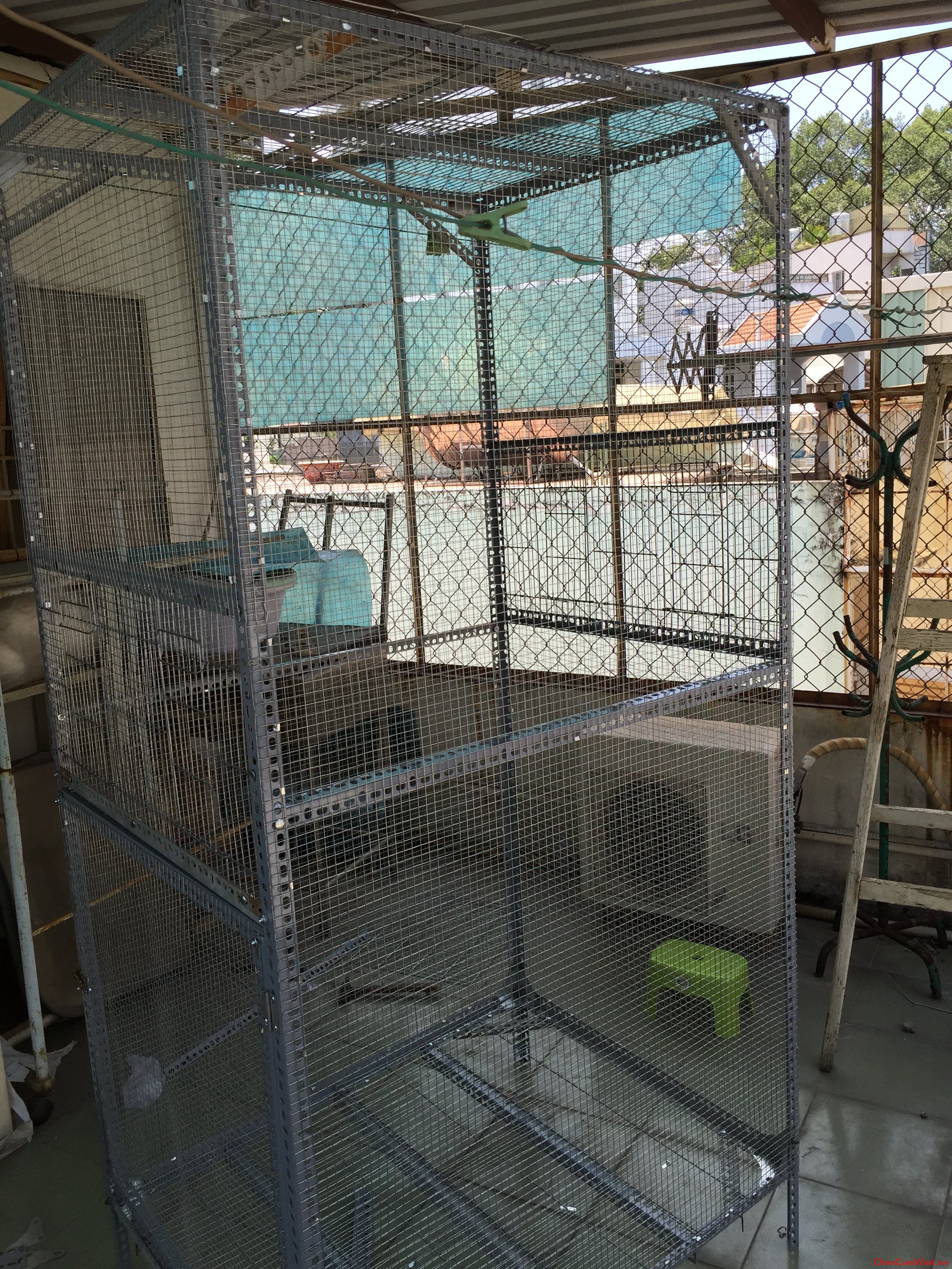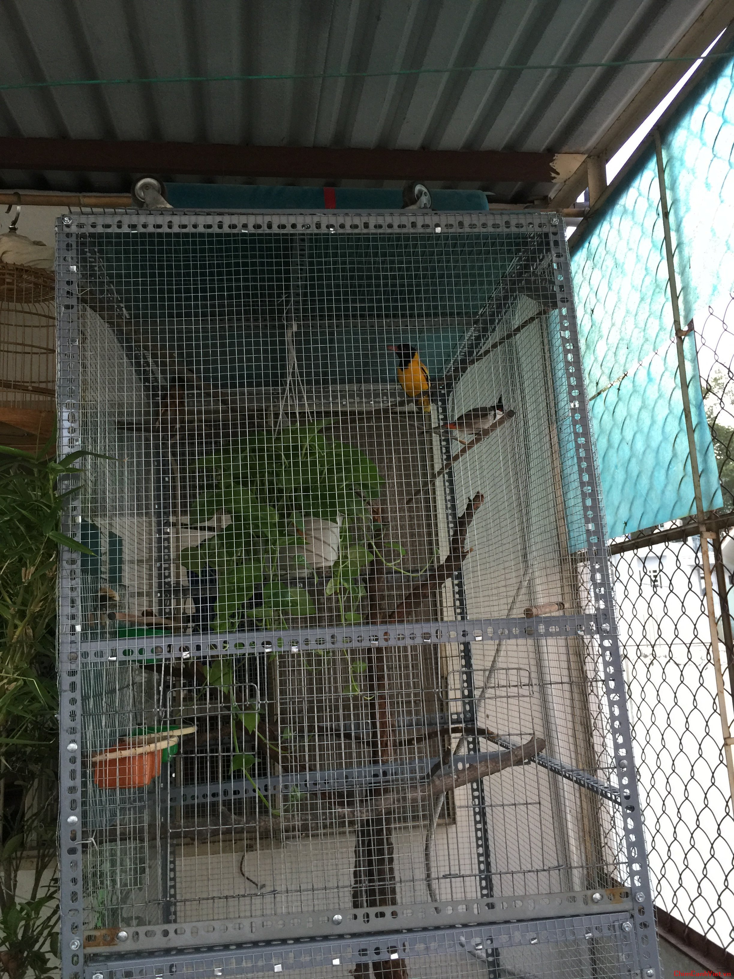3/ Mua 1 lồng sắt khổ 0,8 X 0,5 = 130k, em tận dụng cửa lồng làm cửa thay đồ ăn uống hàng ngày, còn khung lồng sắt làm sàn và nóc aviary.