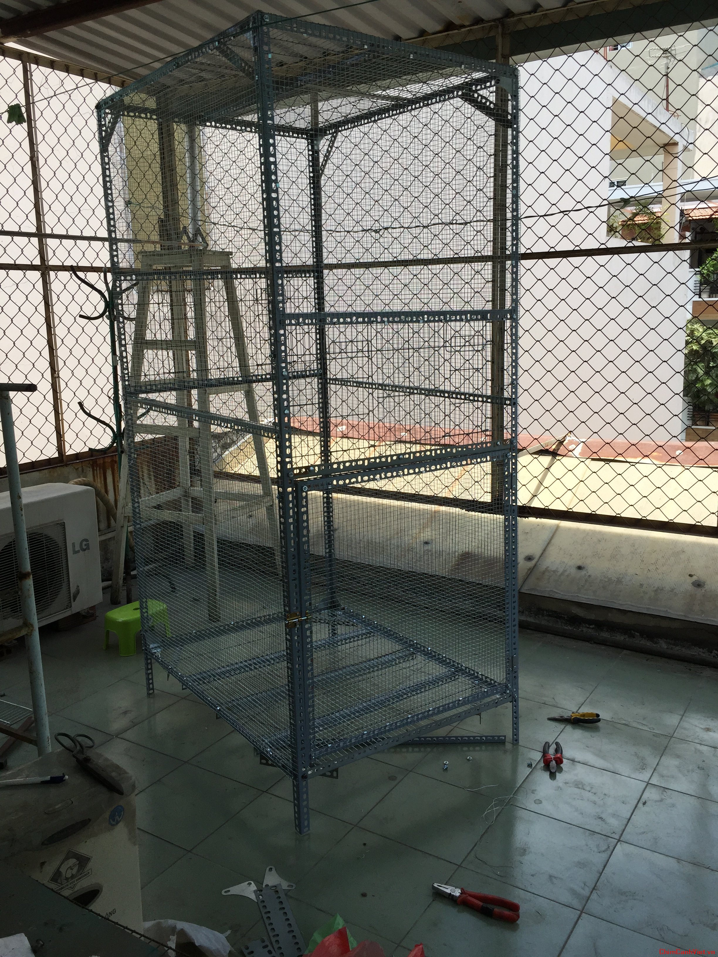 Ngày giỗ tổ mọi người chen nhau đi chơi thì em đi mua vật tư về làm. Em chọn làm khung bằng sắt V đa năng, sơn tĩnh điện để dễ lắp ráp. Sau khi đo kích thước phần sân thượng còn trống, em làm aviary kích thước D 1,2m X R 0,8m X C 2m.